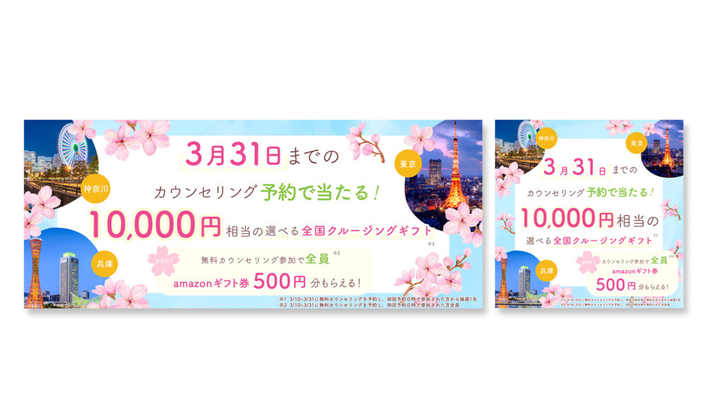 バナー作成 2026年1月26日 最終更新日時 : 2026年1月26日 kouki 【製作時間】3時間/1枚【使用ソフト】Photoshop・illustrator【担当業務】デザイン【意識した亊】春らしい季節感が伝わるデザインにしました。